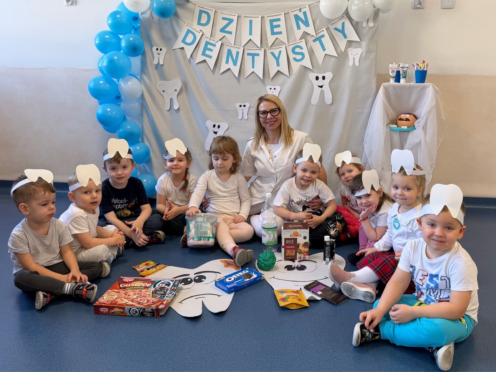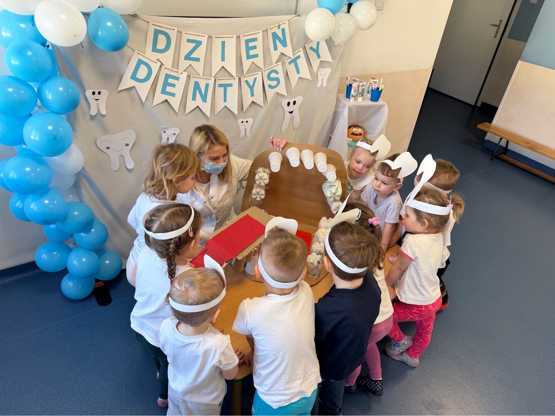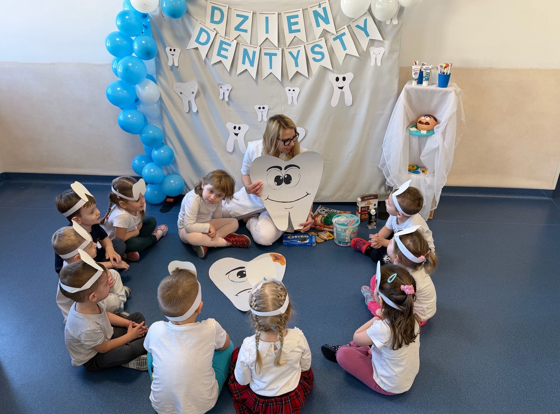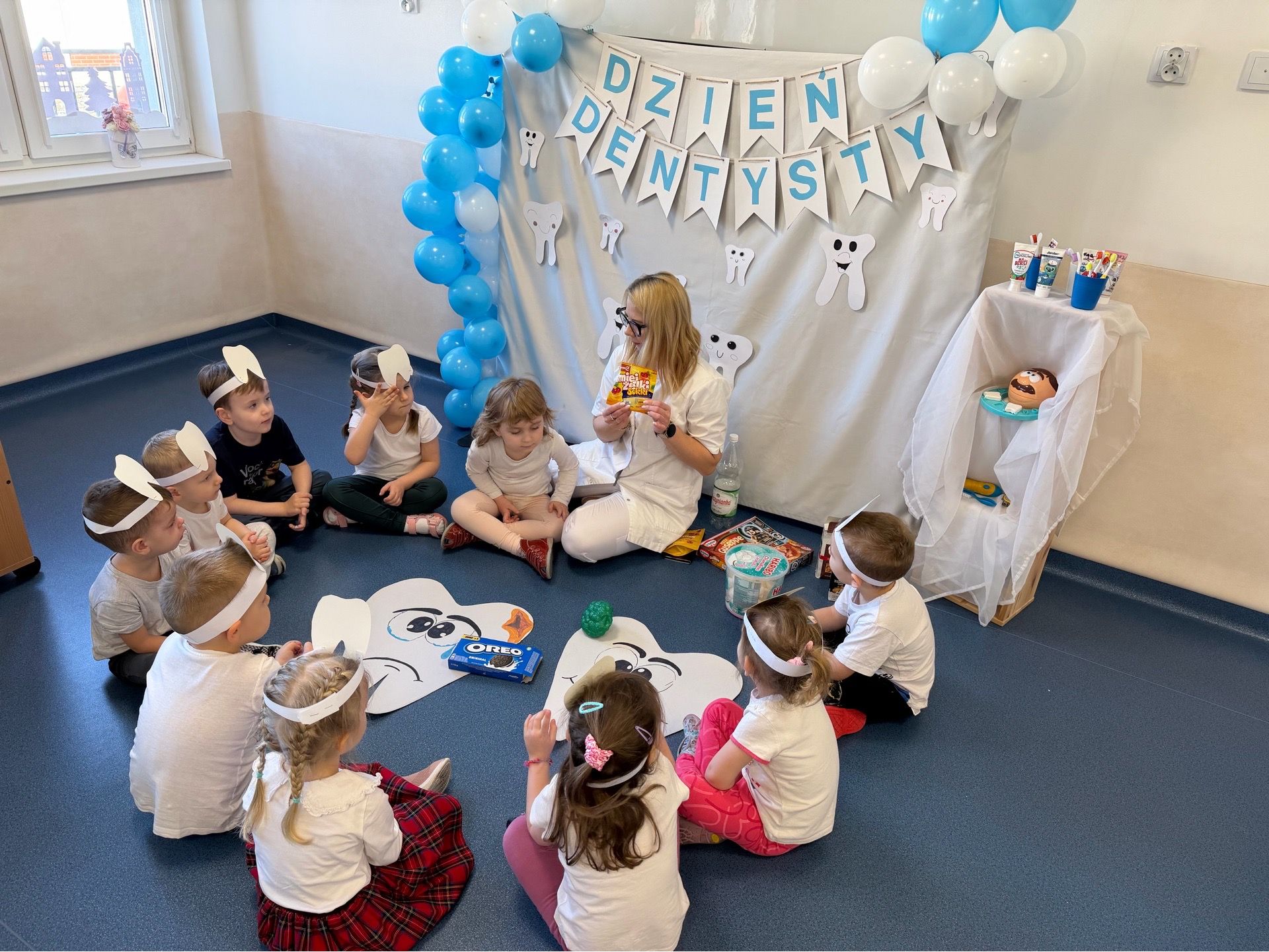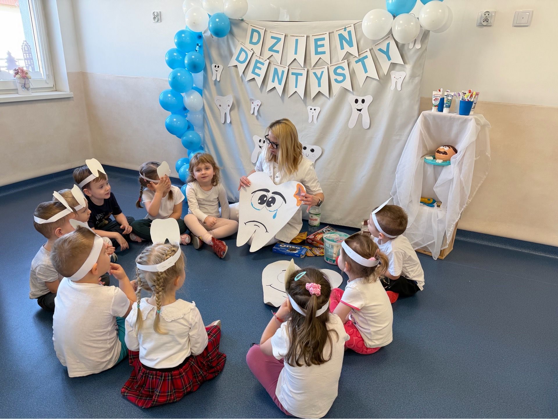 W czwartek, 05.3.2026r., w przedszkolu obchodziliśmy ,, Dzień dentysty ", z tej okazji odwiedziła nas Pani Adrianna Woźniak, która pracuje w centrum kultury i bibliotece w Piaskach. Demonstrowała dzieciom, jak dbać o higienę jamy ustnej. Bardzo dziękujemy za wizytę oraz pozostawiony prezent w formie książeczki :)