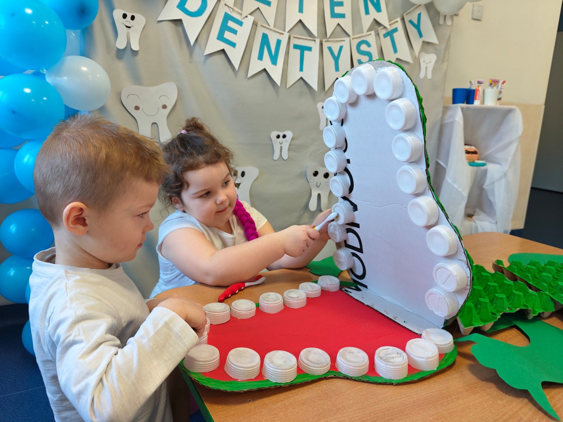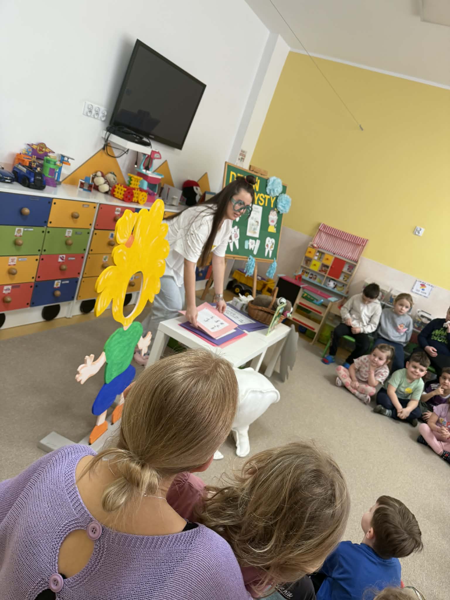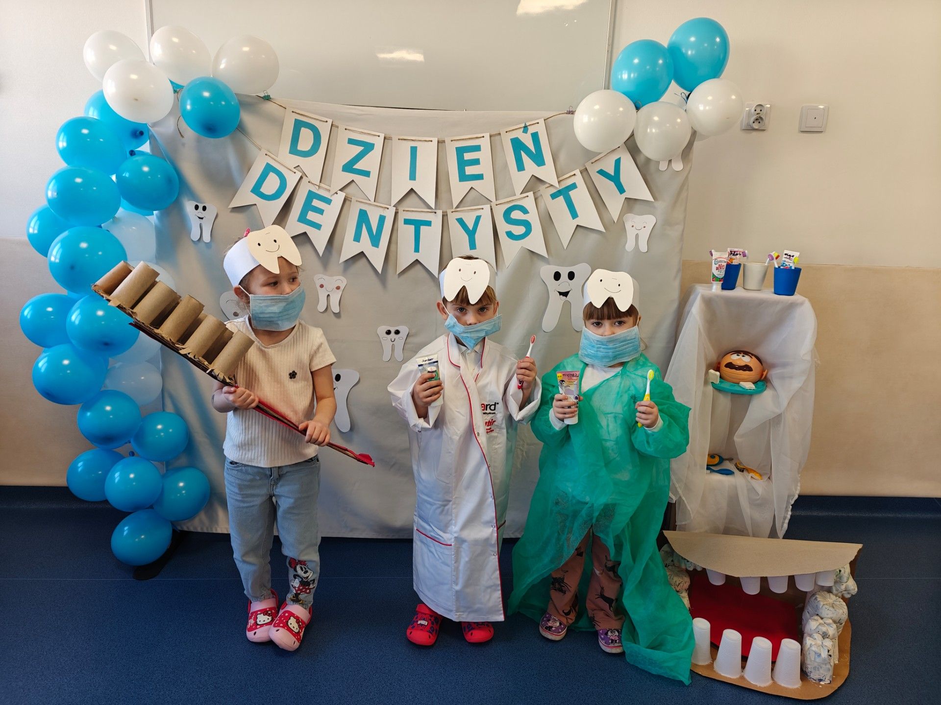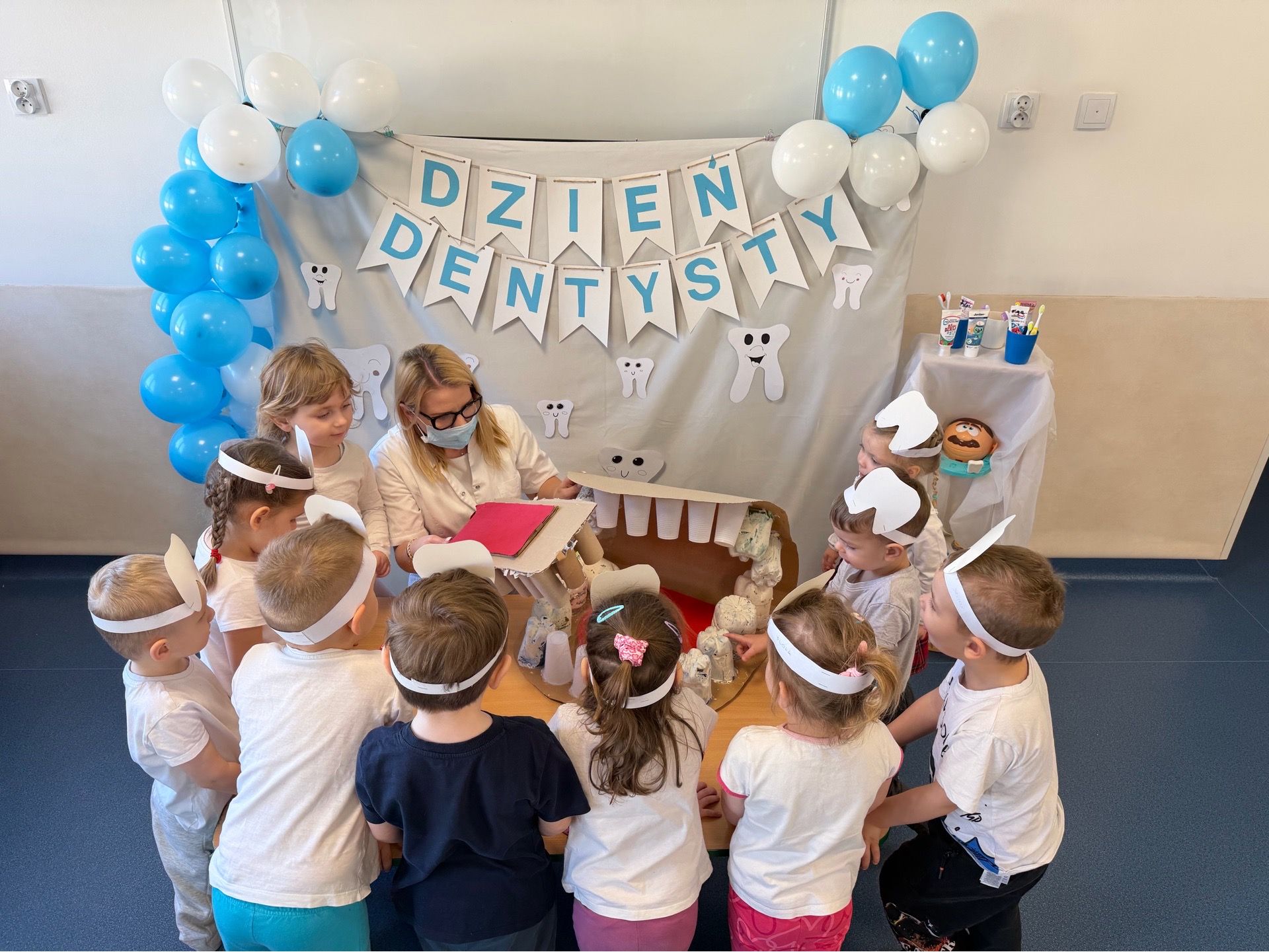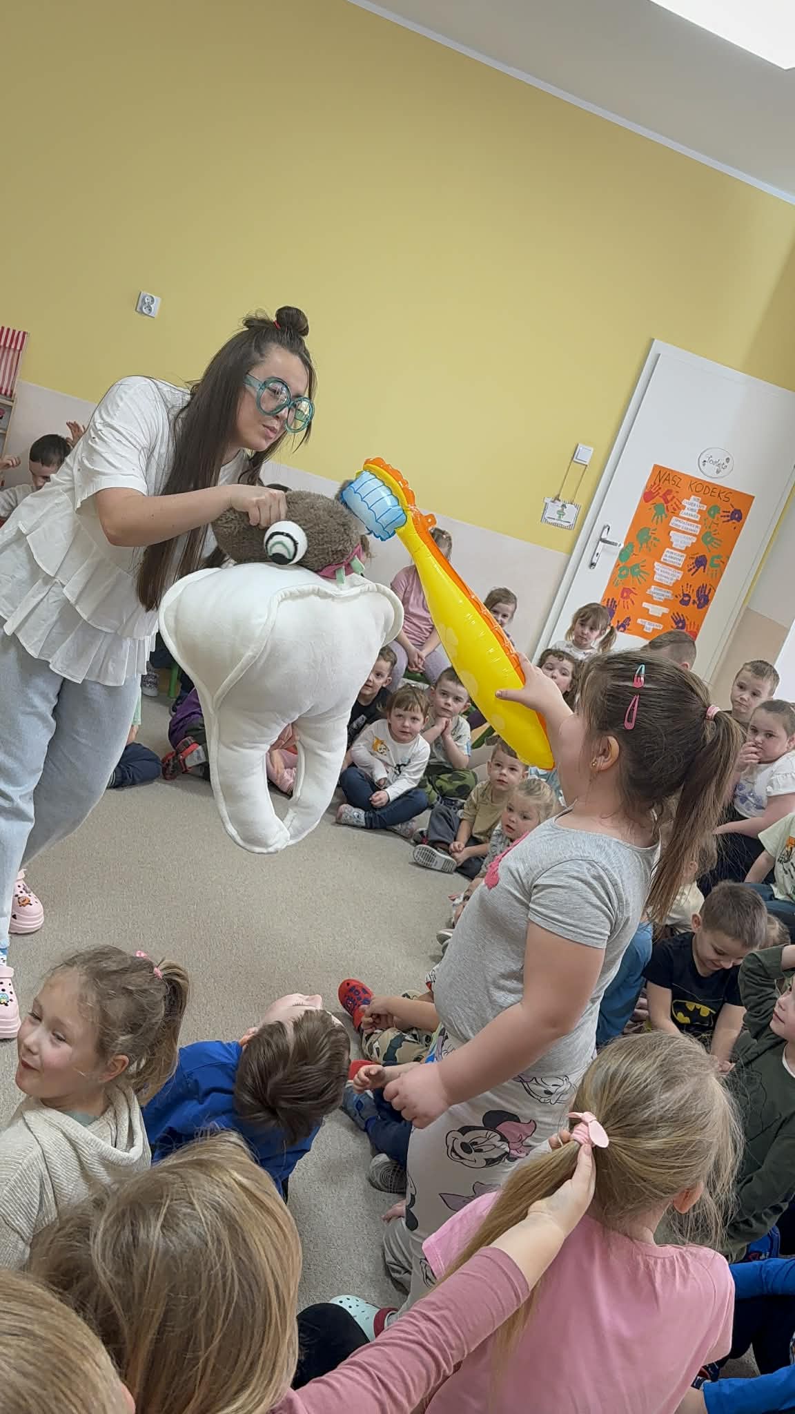 W czwartek, 05.3.2026r., w przedszkolu obchodziliśmy ,, Dzień dentysty ", z tej okazji odwiedziła nas Pani Adrianna Woźniak, która pracuje w centrum kultury i bibliotece w Piaskach. Demonstrowała dzieciom, jak dbać o higienę jamy ustnej. Bardzo dziękujemy za wizytę oraz pozostawiony prezent w formie książeczki :)