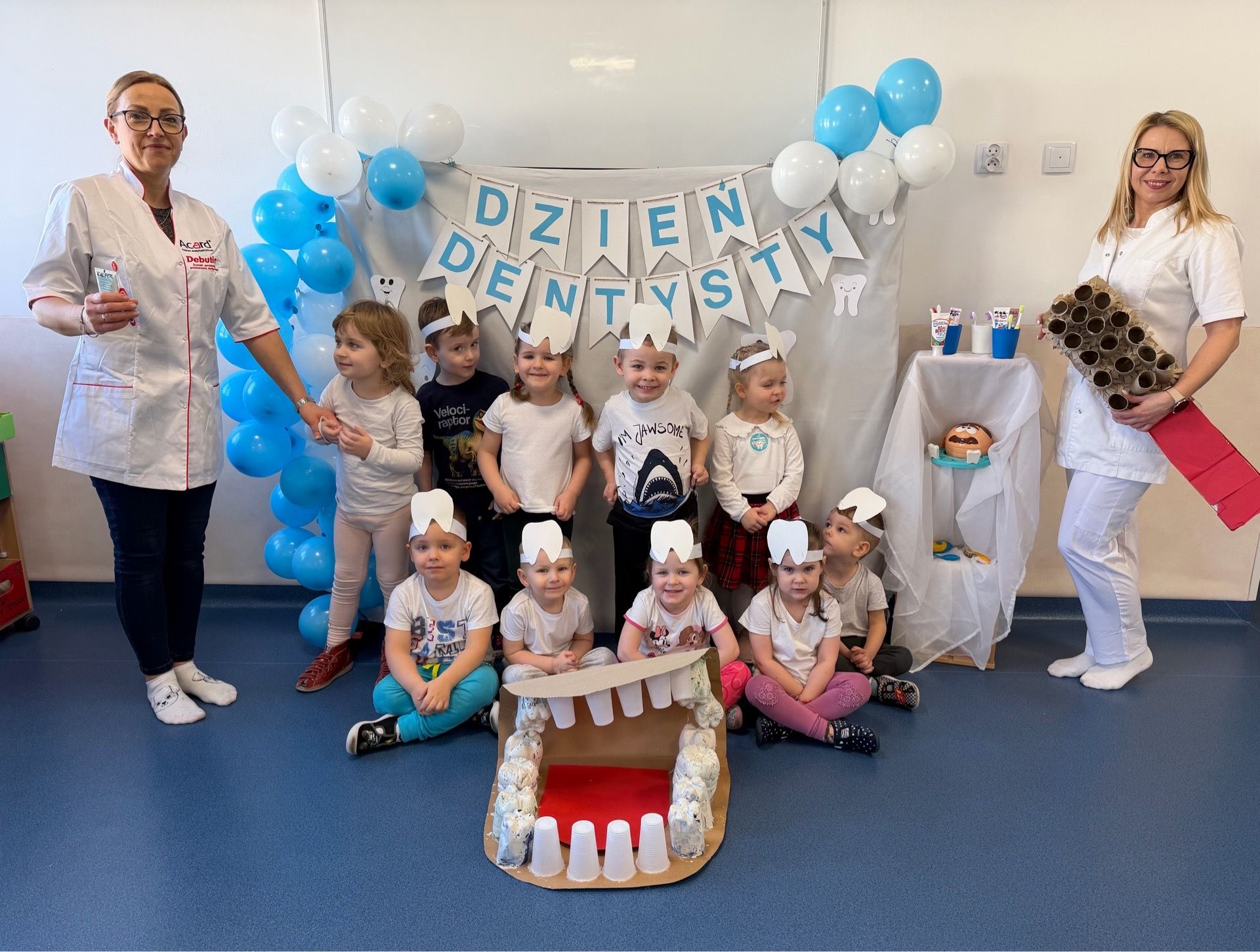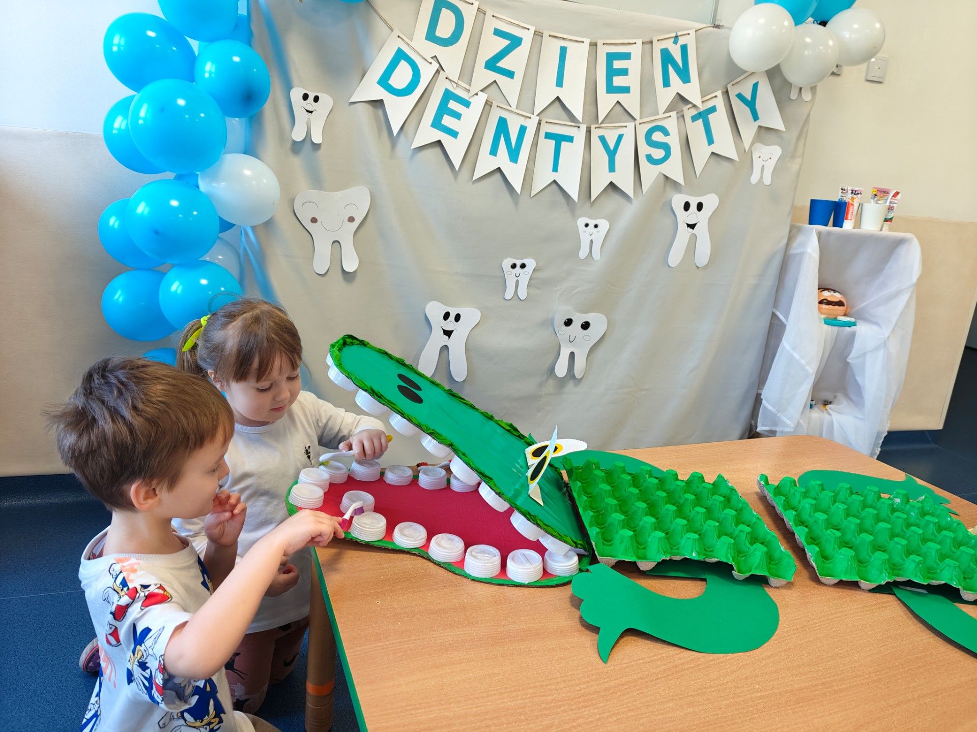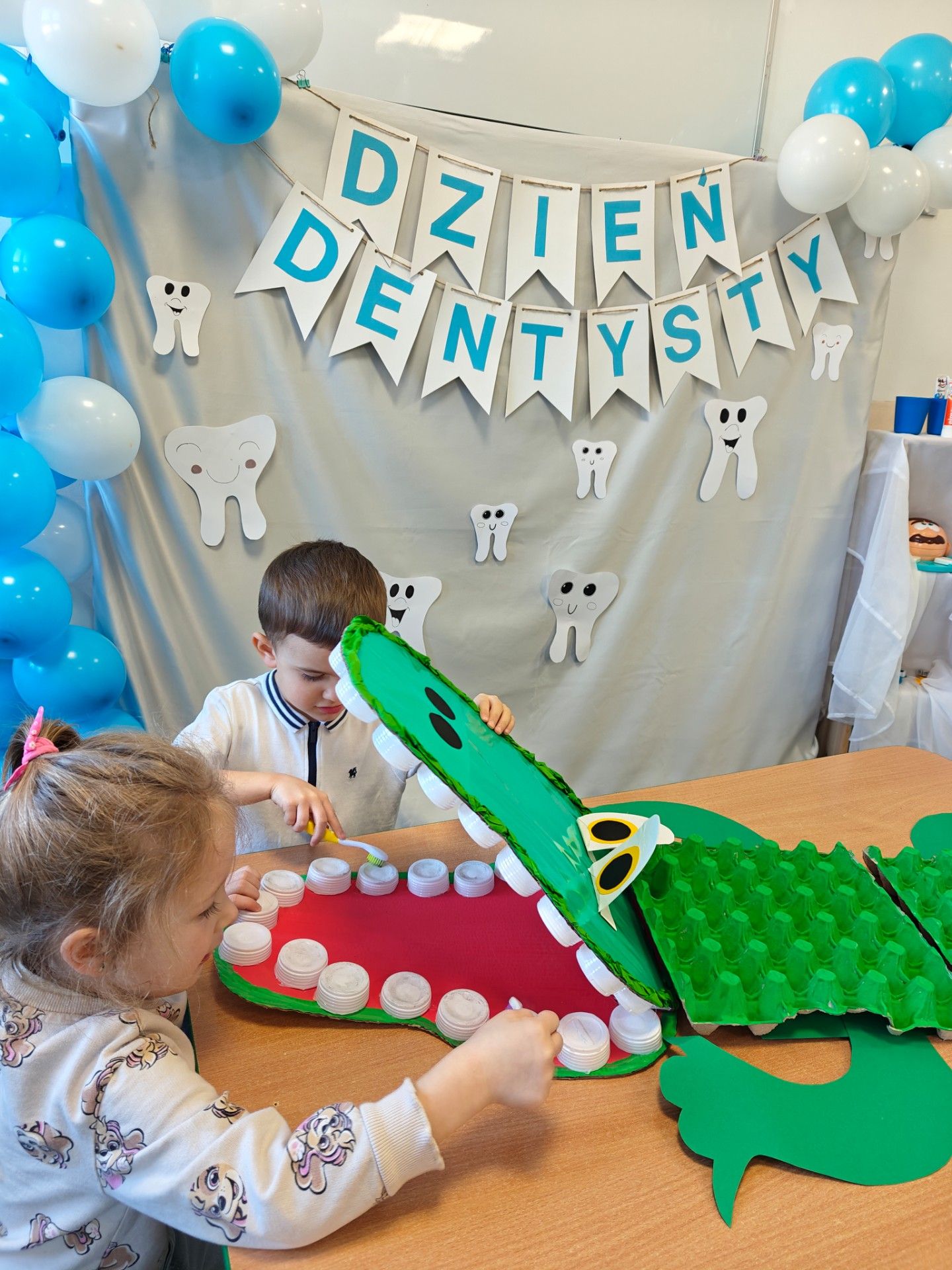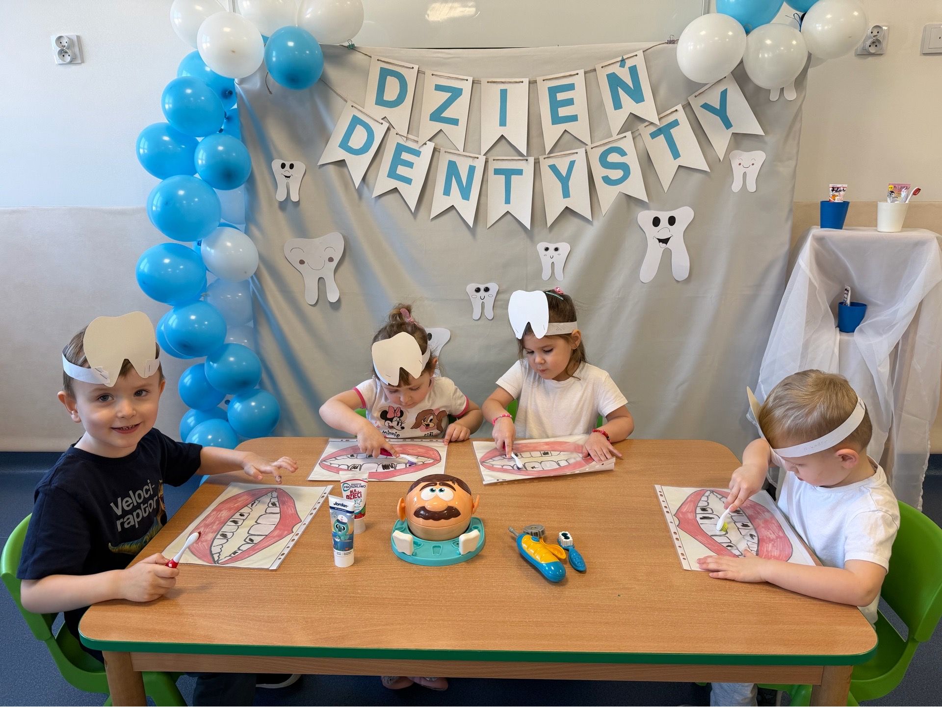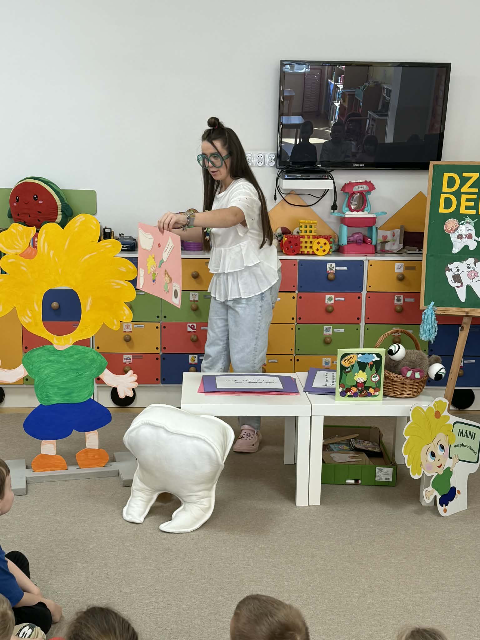 W czwartek, 05.3.2026r., w przedszkolu obchodziliśmy ,, Dzień dentysty ", z tej okazji odwiedziła nas Pani Adrianna Woźniak, która pracuje w centrum kultury i bibliotece w Piaskach. Demonstrowała dzieciom, jak dbać o higienę jamy ustnej. Bardzo dziękujemy za wizytę oraz pozostawiony prezent w formie książeczki :)