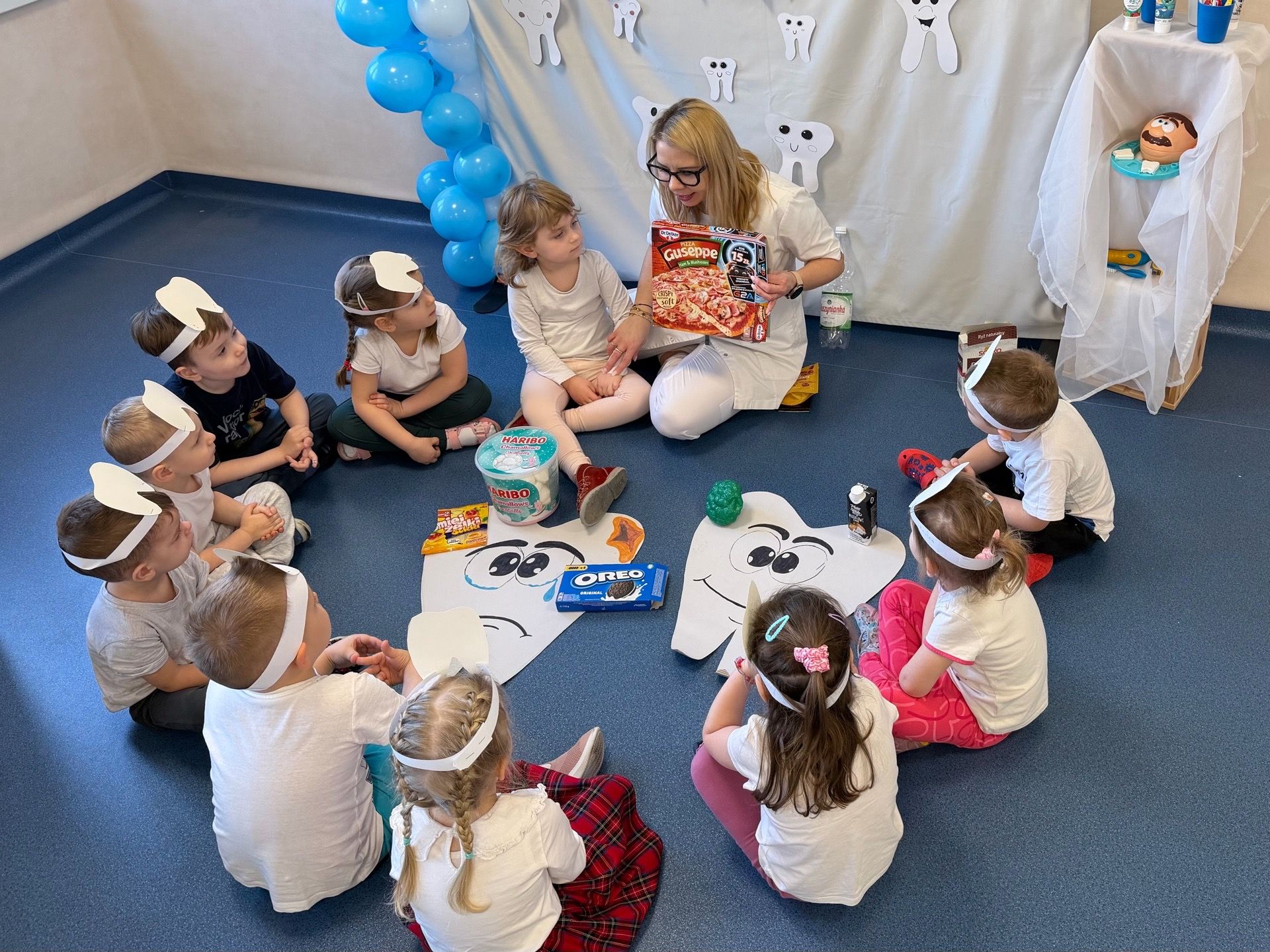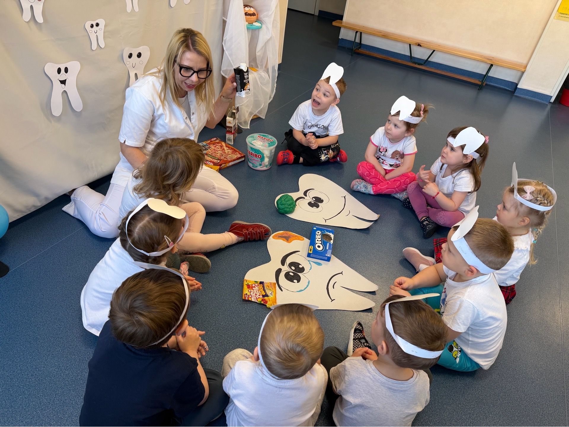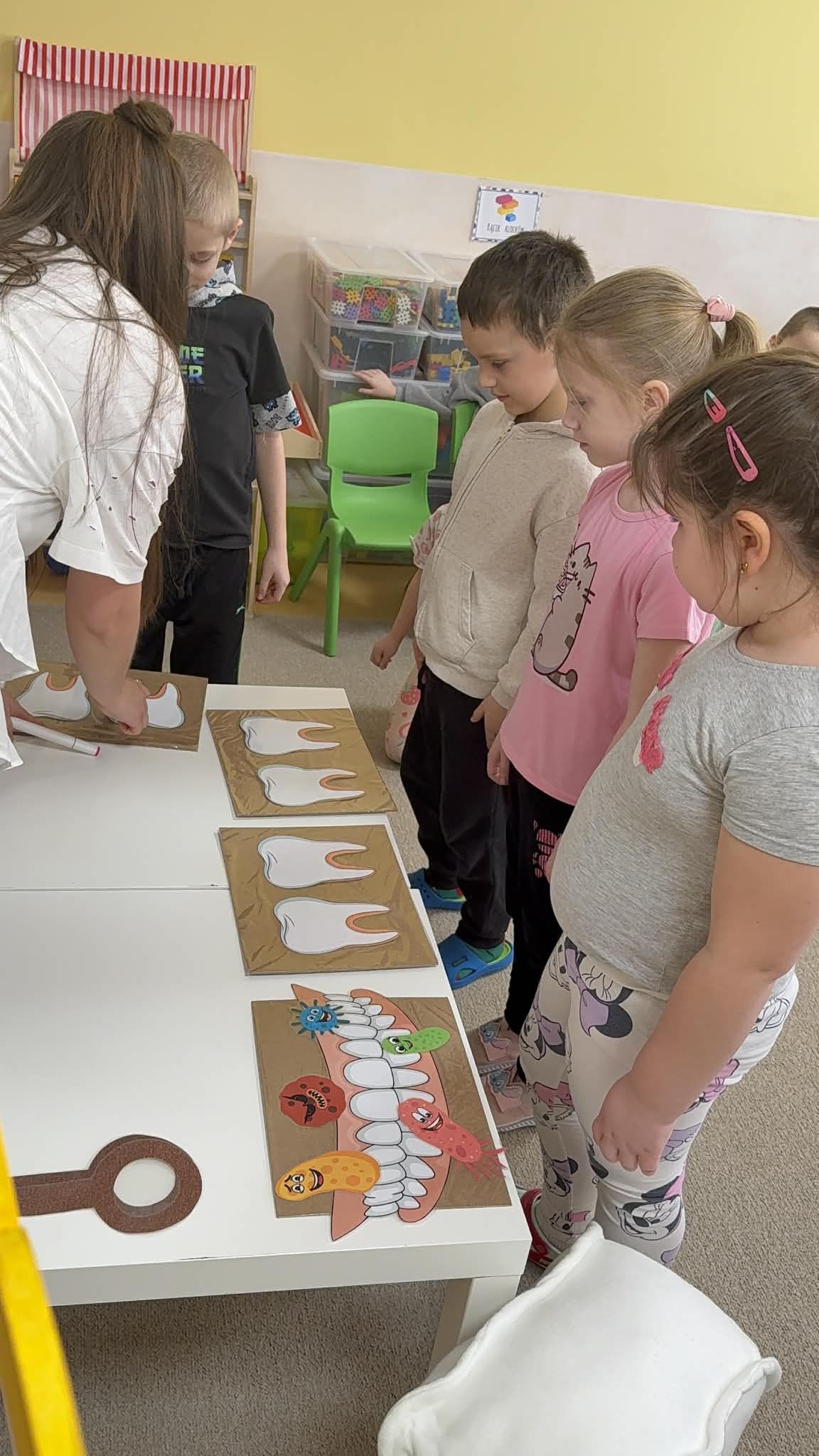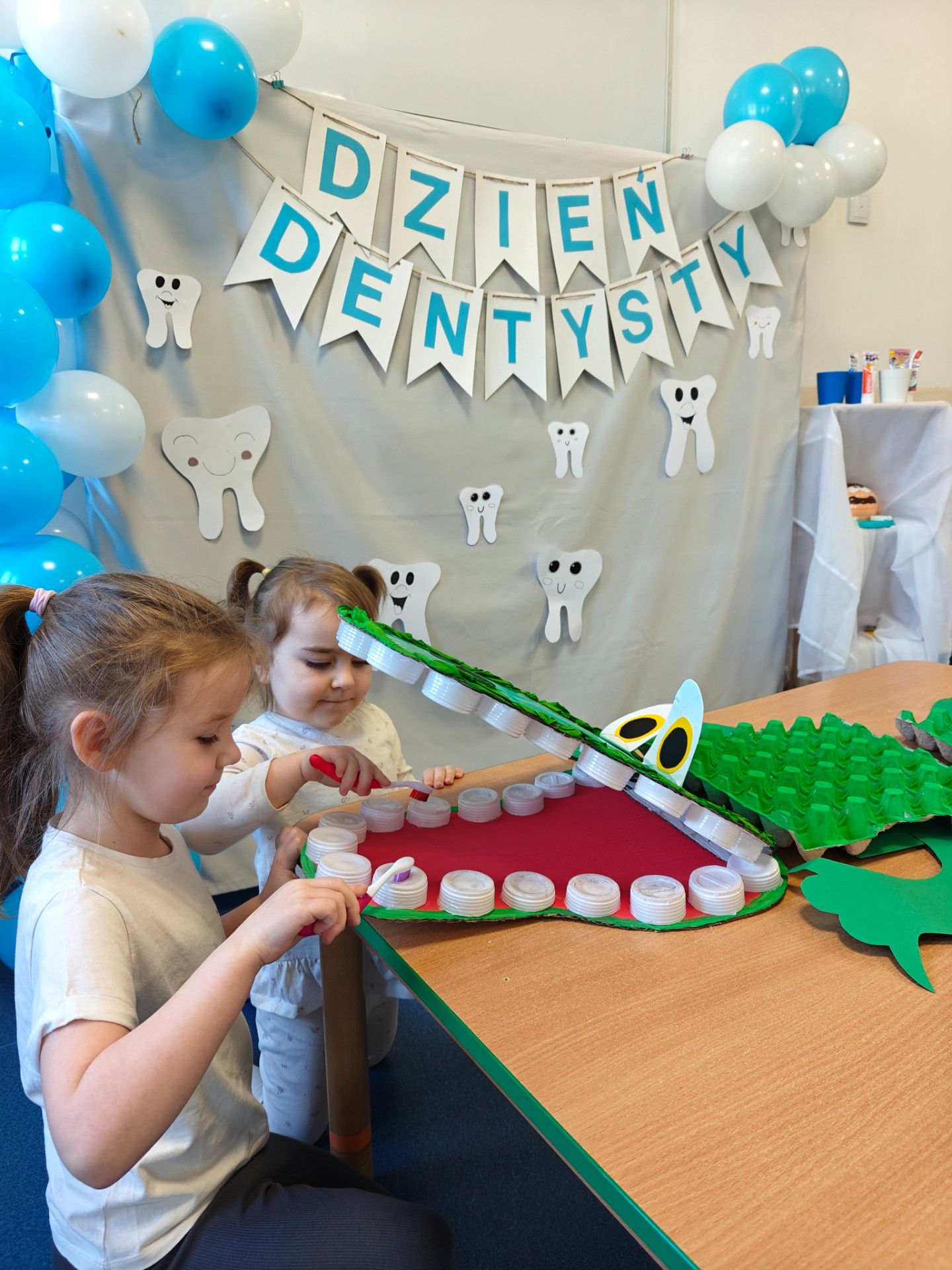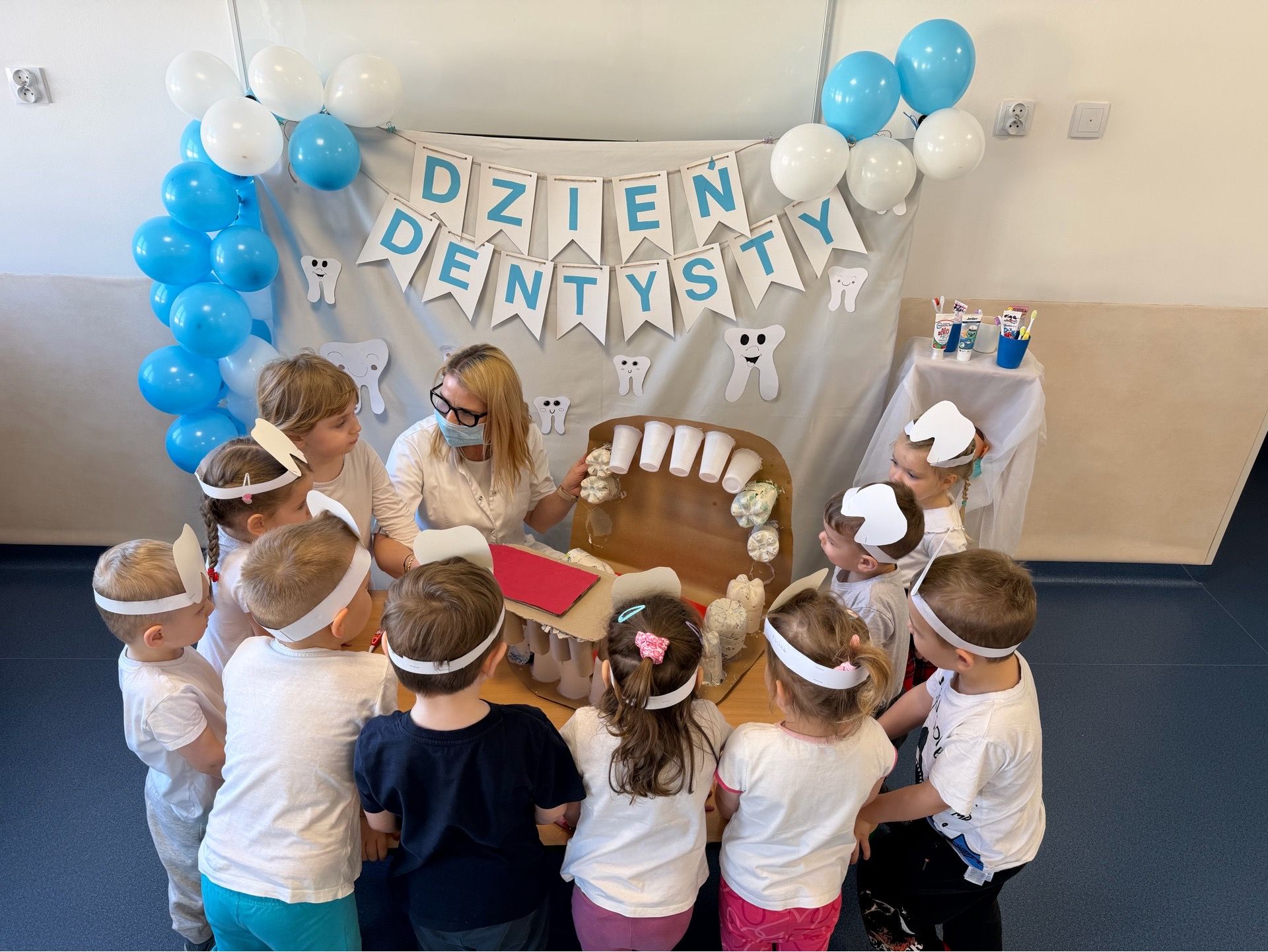 W czwartek, 05.3.2026r., w przedszkolu obchodziliśmy ,, Dzień dentysty ", z tej okazji odwiedziła nas Pani Adrianna Woźniak, która pracuje w centrum kultury i bibliotece w Piaskach. Demonstrowała dzieciom, jak dbać o higienę jamy ustnej. Bardzo dziękujemy za wizytę oraz pozostawiony prezent w formie książeczki :)