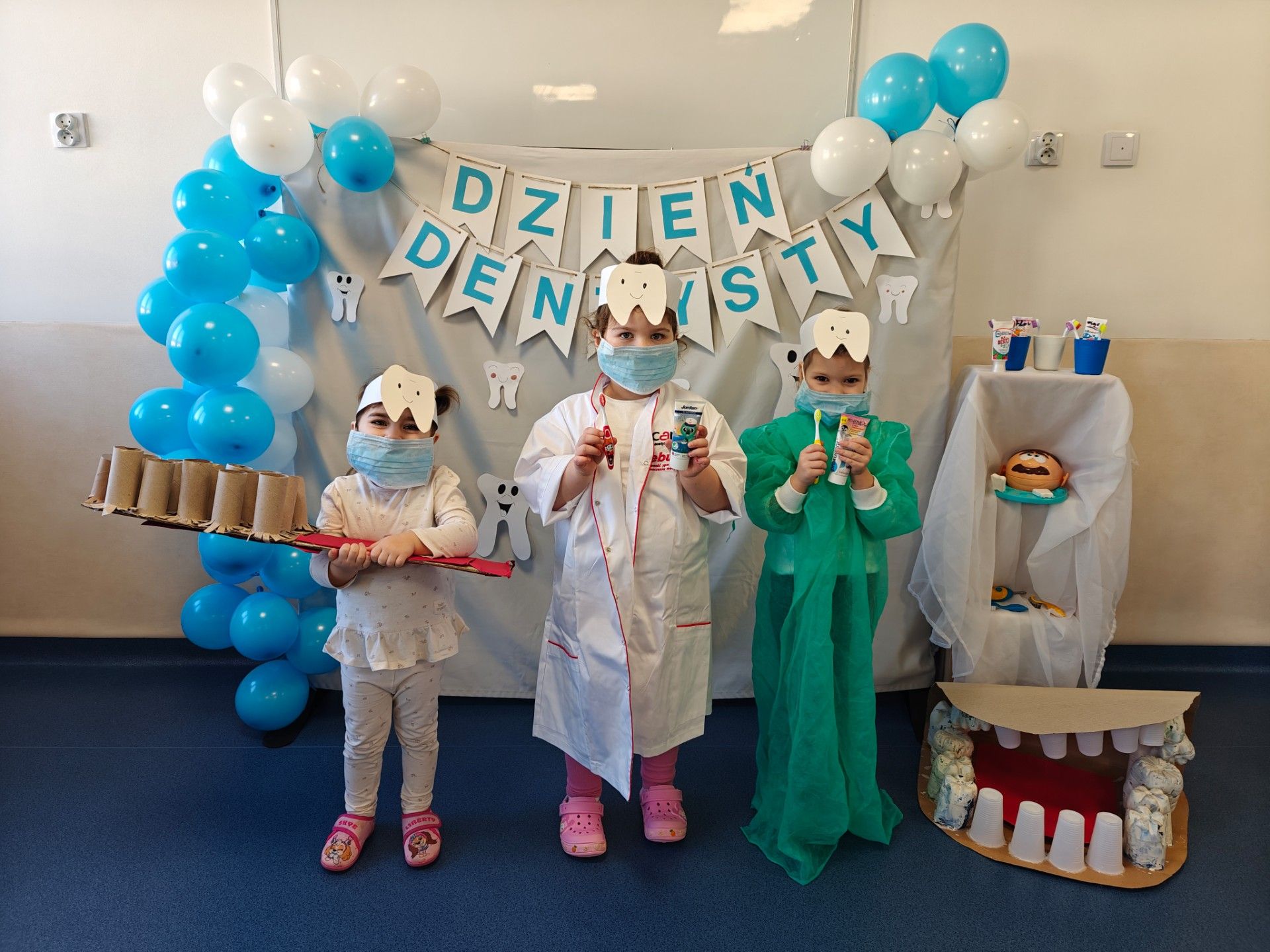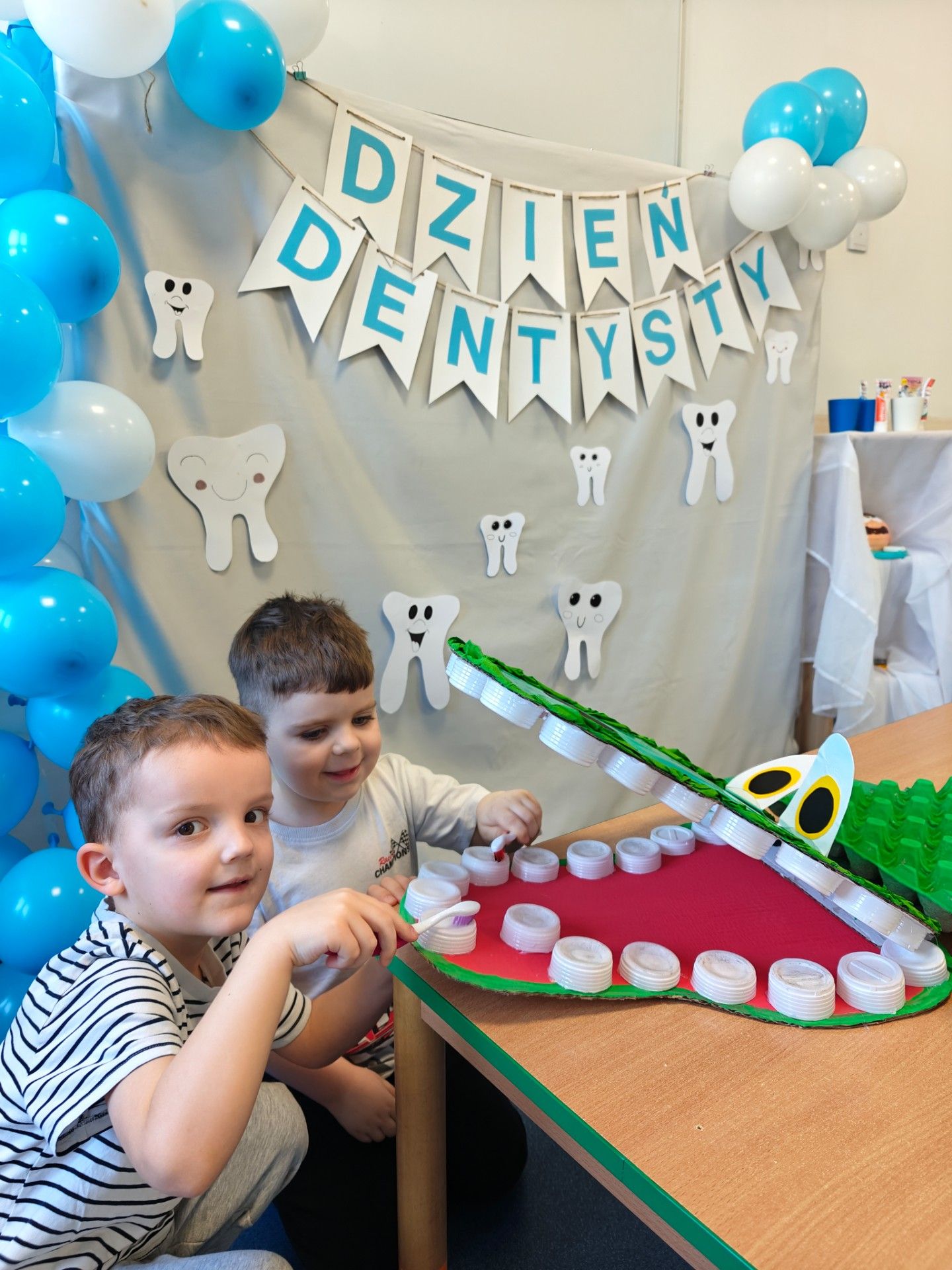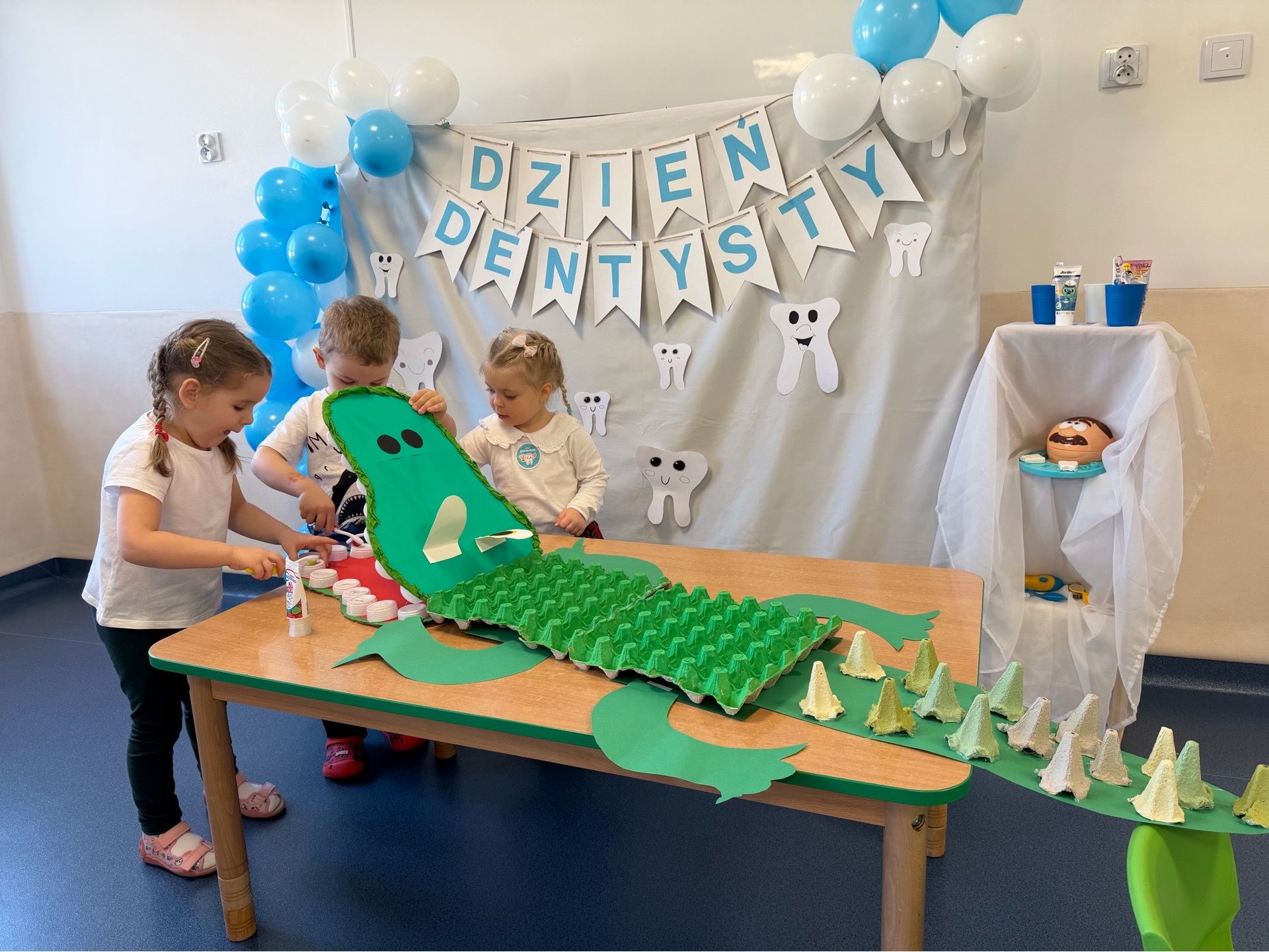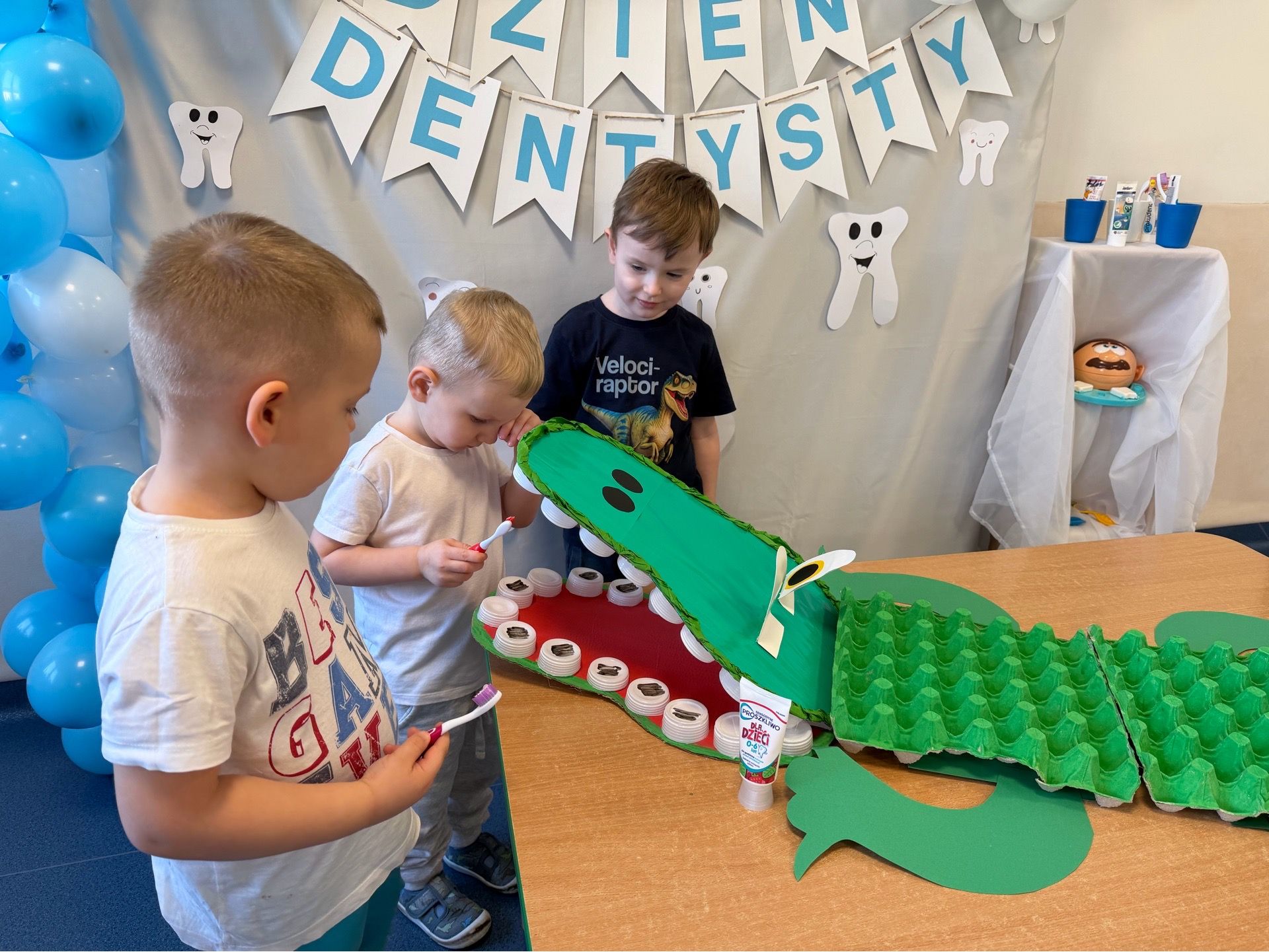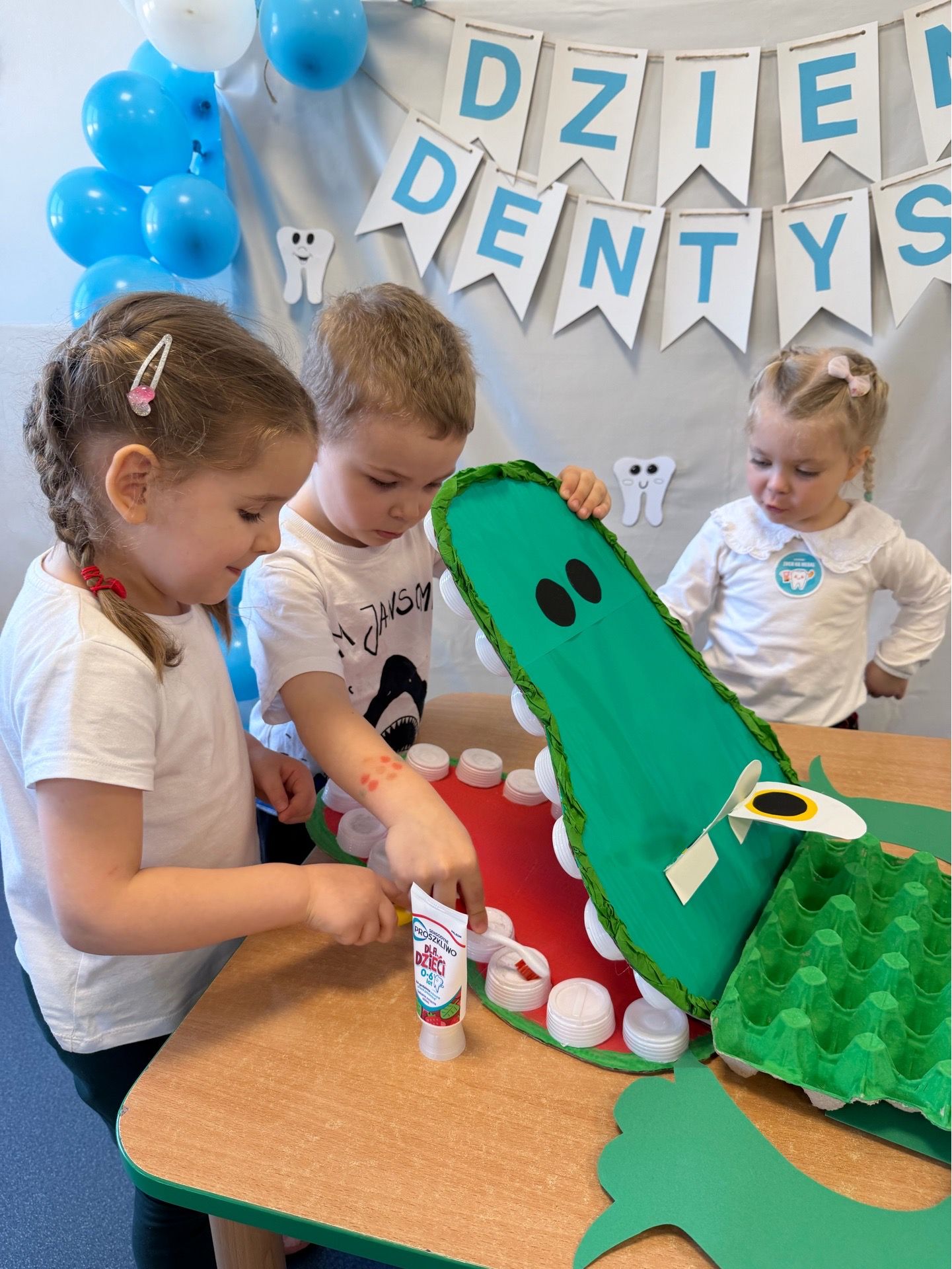 W czwartek, 05.3.2026r., w przedszkolu obchodziliśmy ,, Dzień dentysty ", z tej okazji odwiedziła nas Pani Adrianna Woźniak, która pracuje w centrum kultury i bibliotece w Piaskach. Demonstrowała dzieciom, jak dbać o higienę jamy ustnej. Bardzo dziękujemy za wizytę oraz pozostawiony prezent w formie książeczki :)
