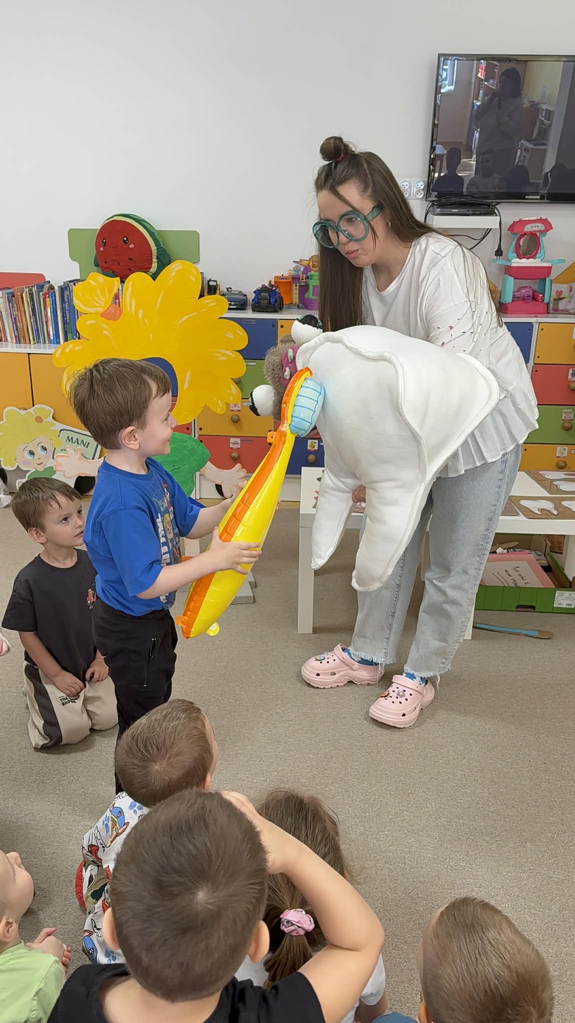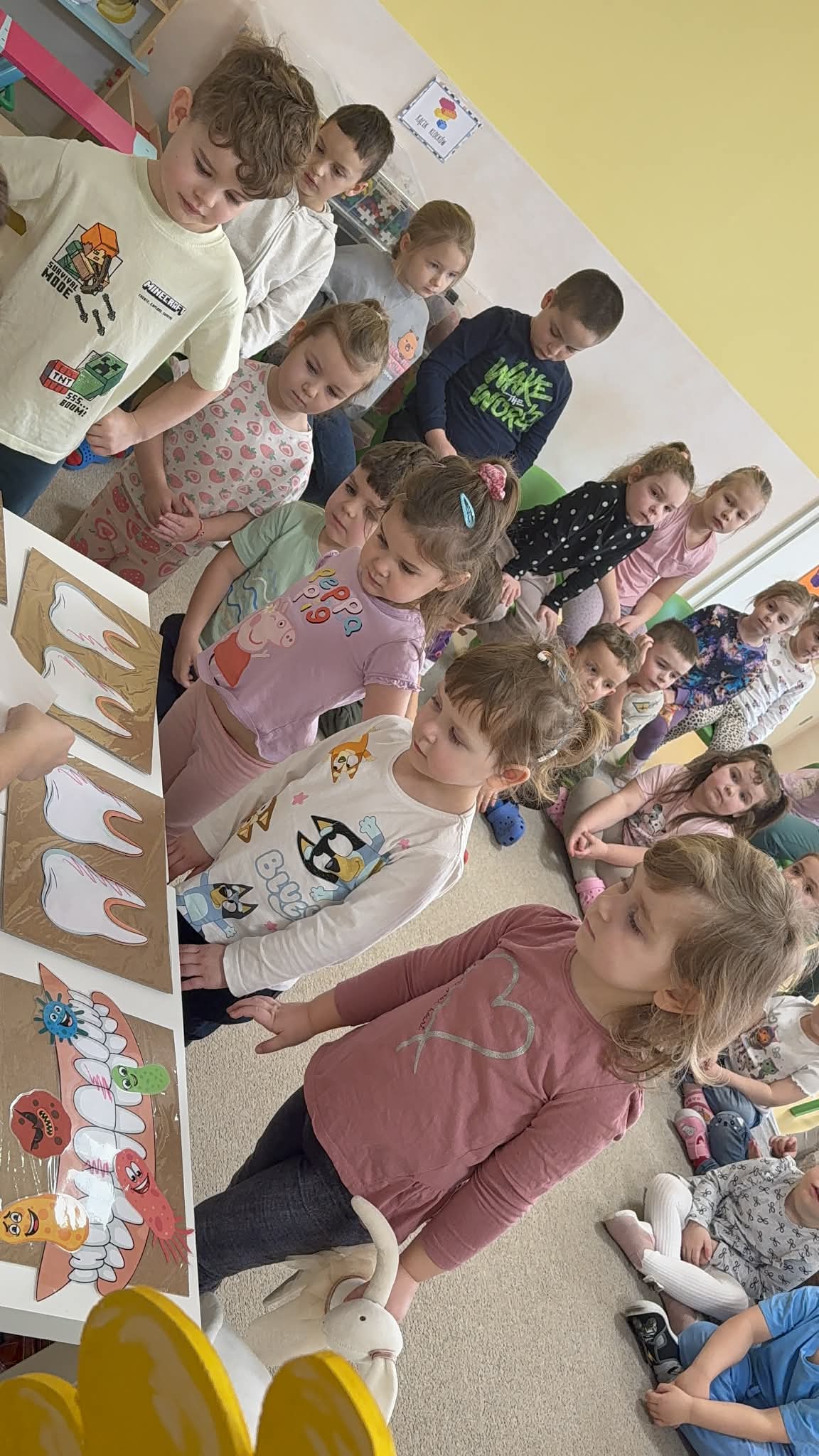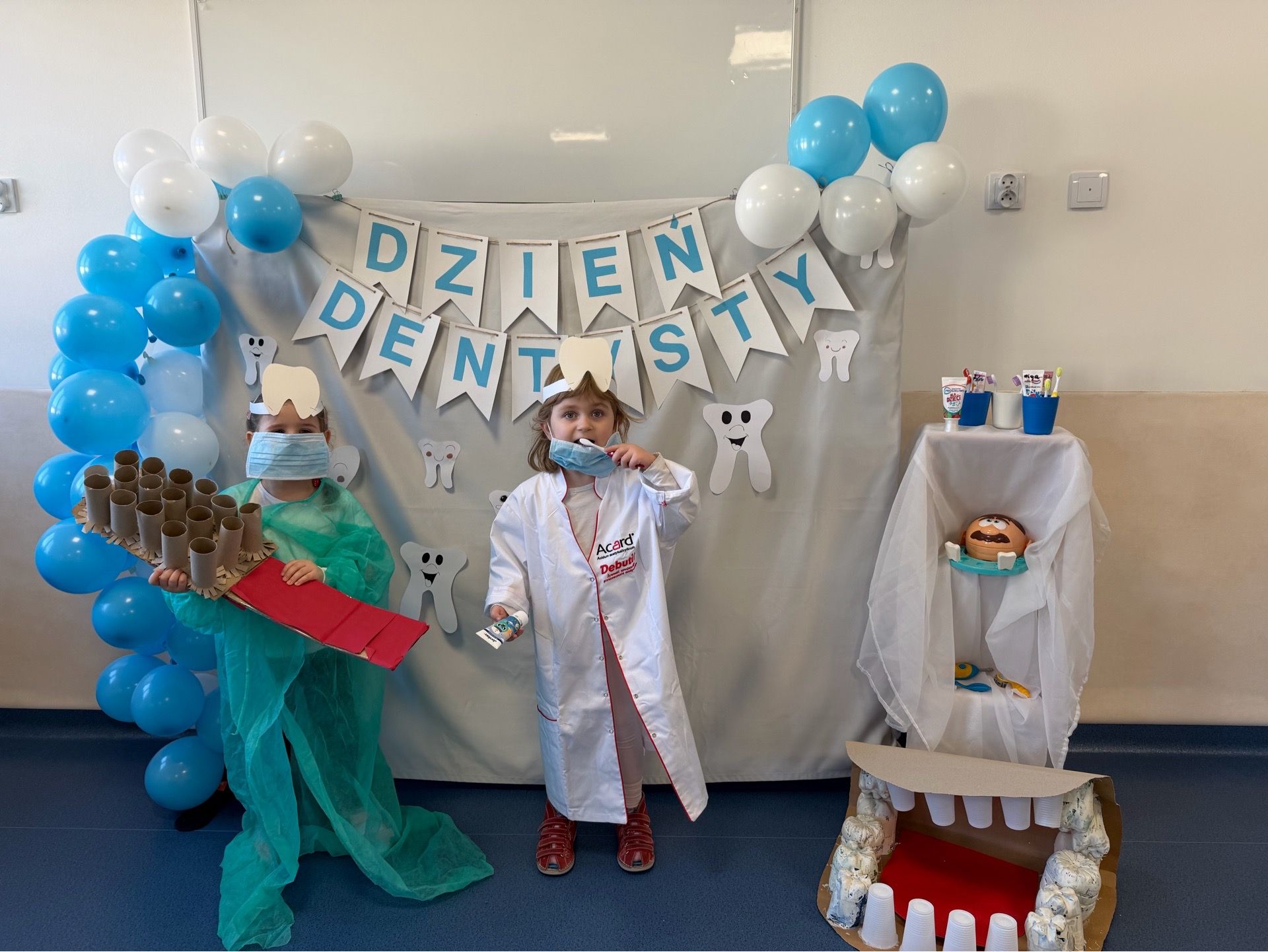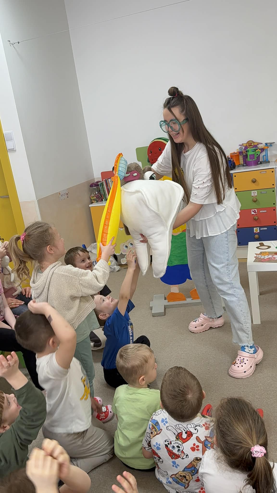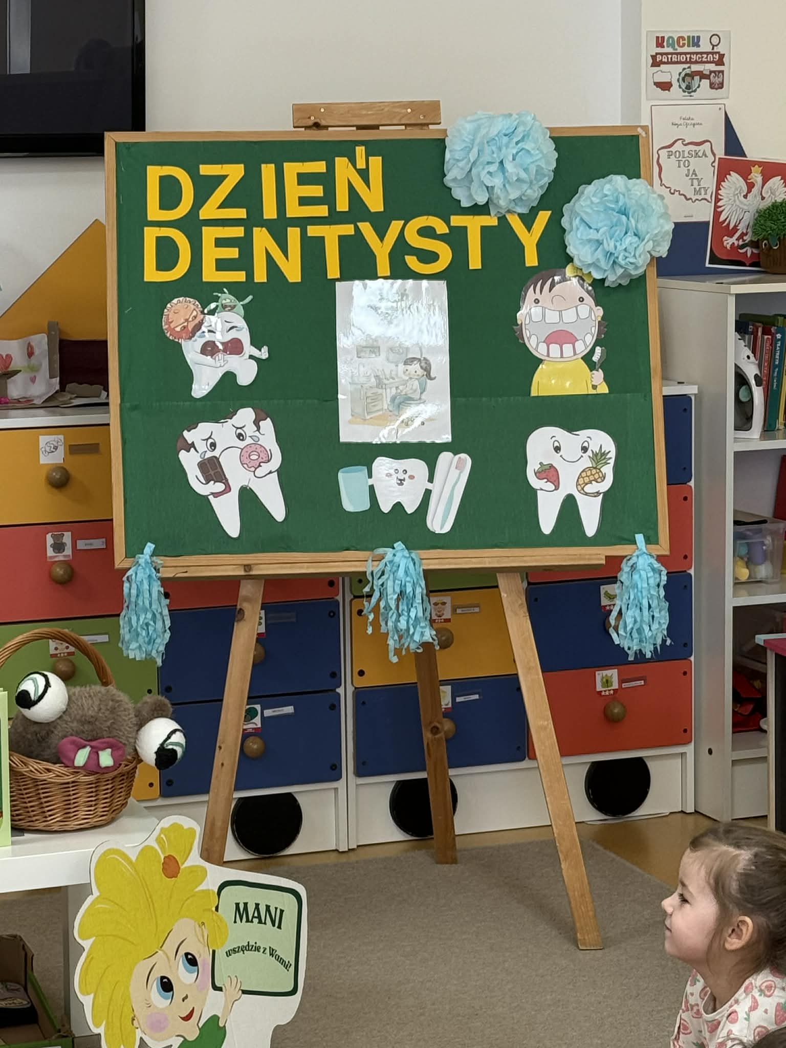 W czwartek, 05.3.2026r., w przedszkolu obchodziliśmy ,, Dzień dentysty ", z tej okazji odwiedziła nas Pani Adrianna Woźniak, która pracuje w centrum kultury i bibliotece w Piaskach. Demonstrowała dzieciom, jak dbać o higienę jamy ustnej. Bardzo dziękujemy za wizytę oraz pozostawiony prezent w formie książeczki :)