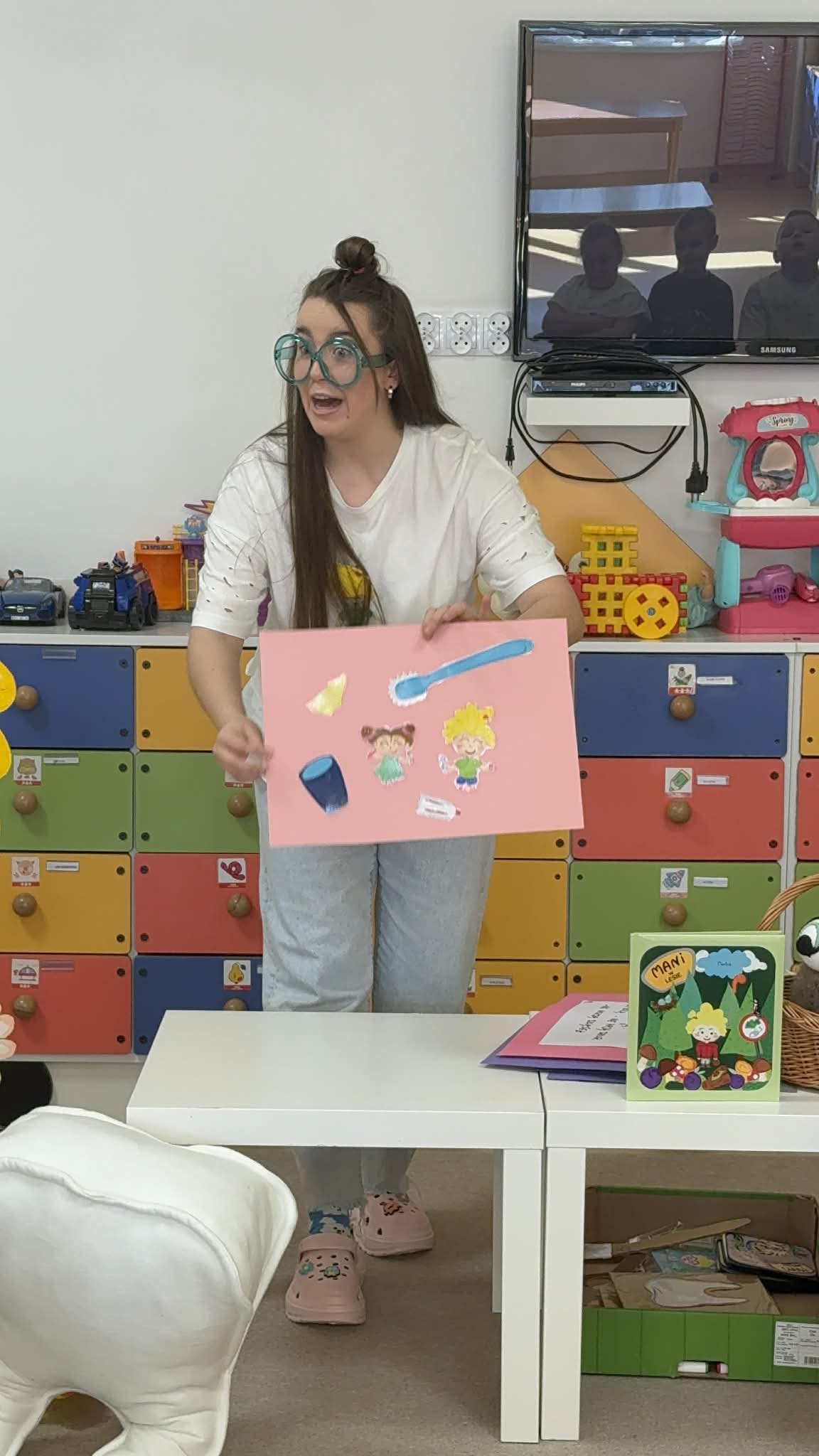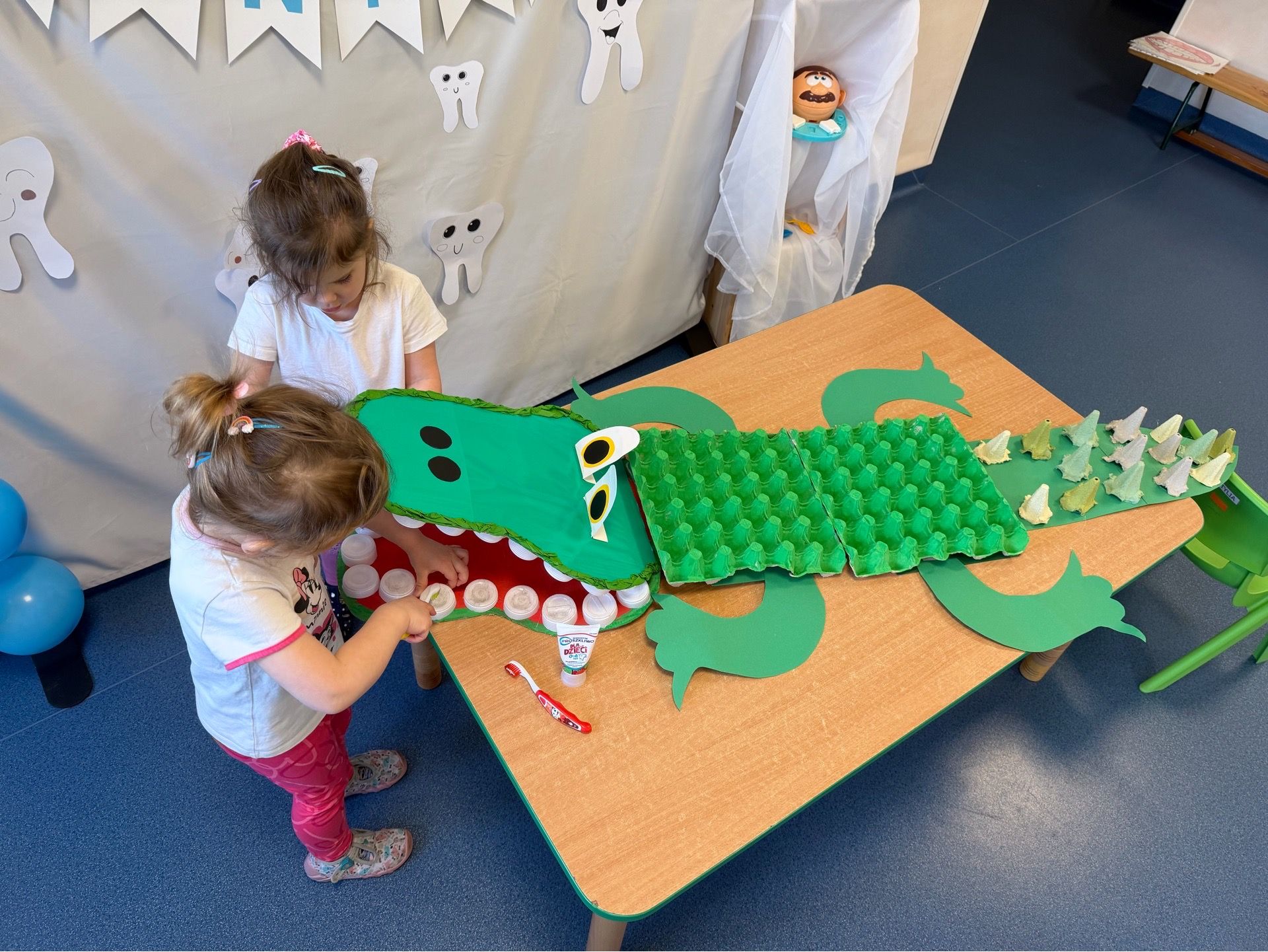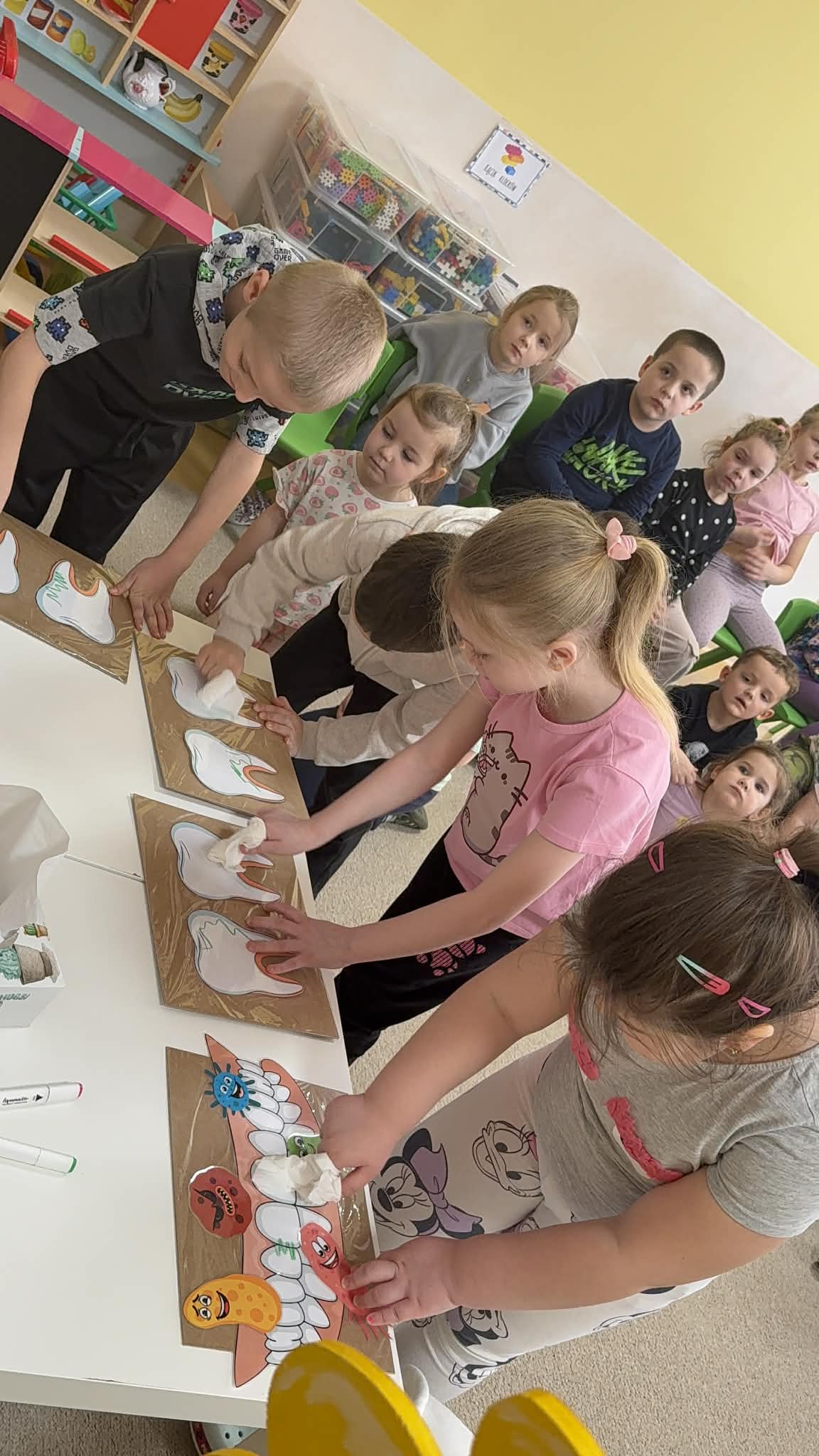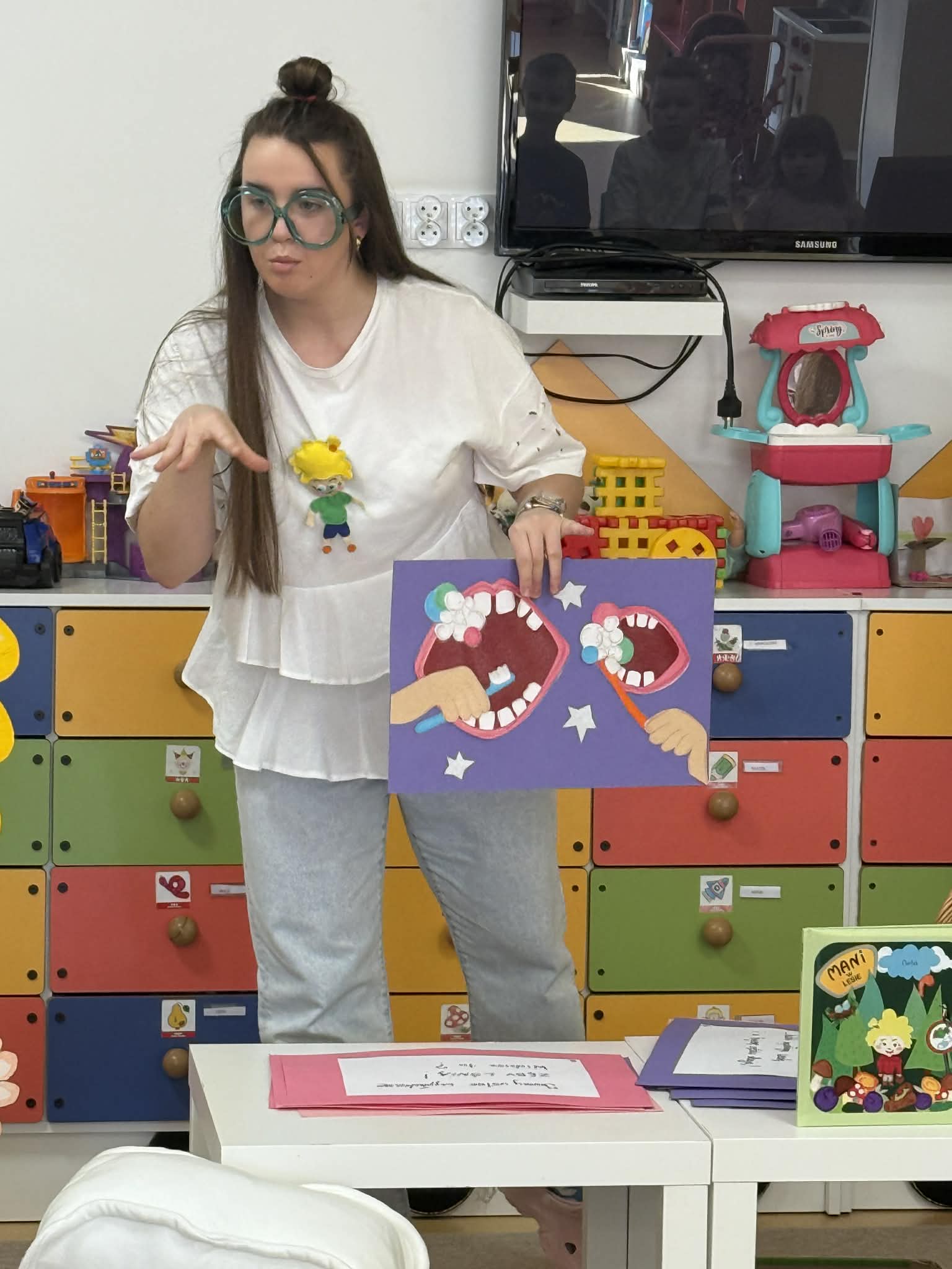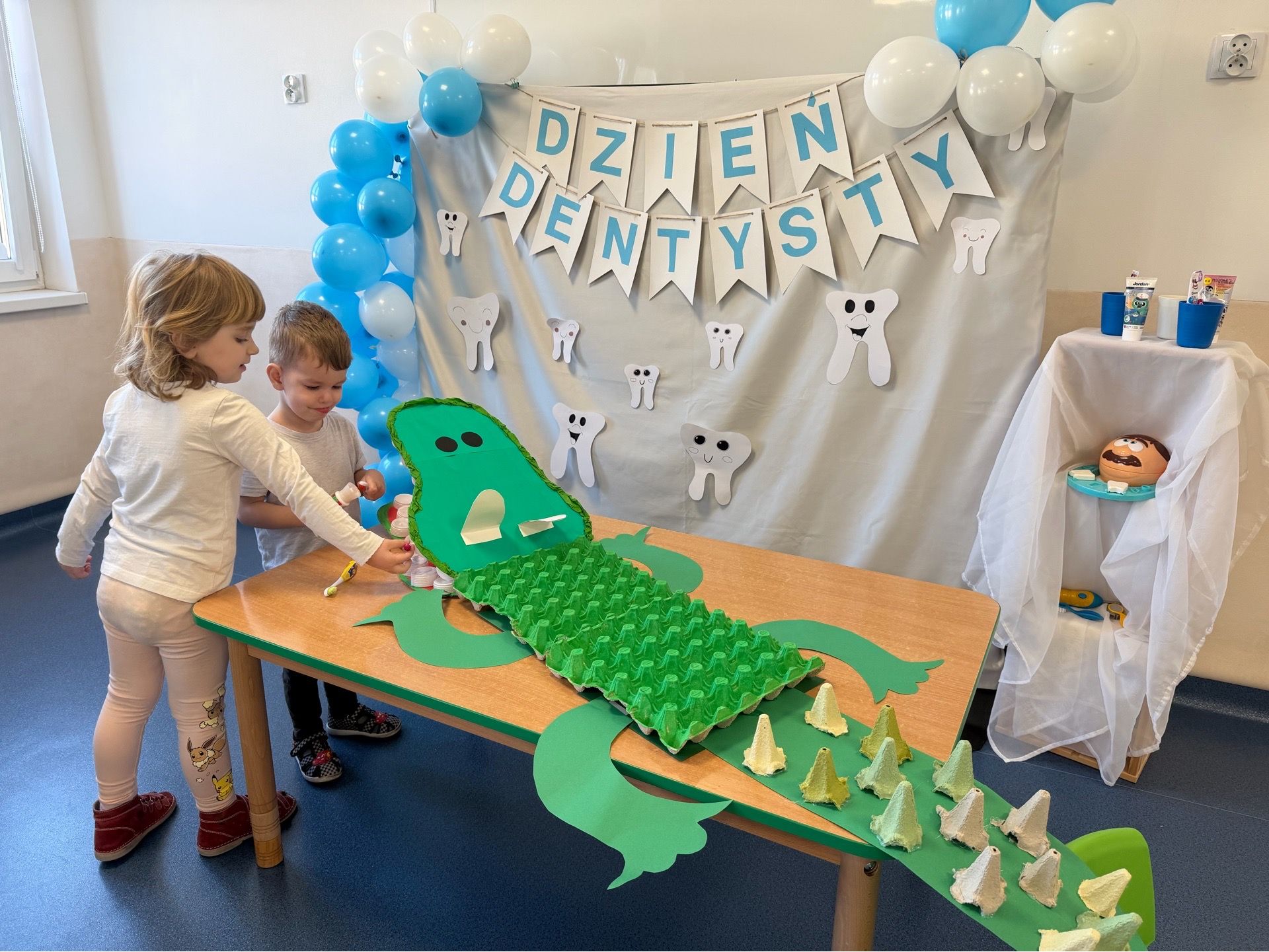 W czwartek, 05.3.2026r., w przedszkolu obchodziliśmy ,, Dzień dentysty ", z tej okazji odwiedziła nas Pani Adrianna Woźniak, która pracuje w centrum kultury i bibliotece w Piaskach. Demonstrowała dzieciom, jak dbać o higienę jamy ustnej. Bardzo dziękujemy za wizytę oraz pozostawiony prezent w formie książeczki :)